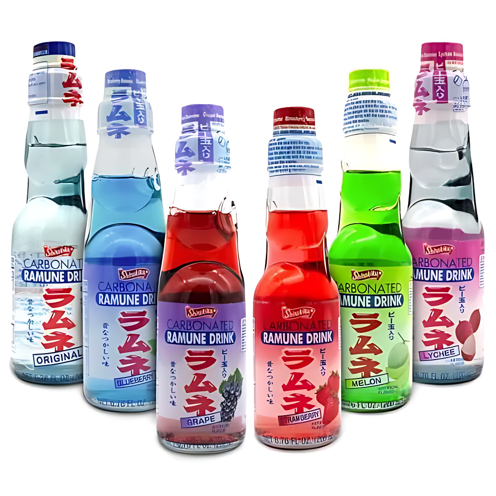 A fun Japanese soda with a signature marble-sealed bottle, offering a refreshing and slightly citrusy taste. The fizzy drink is available in various flavors, with a light and crisp carbonation.