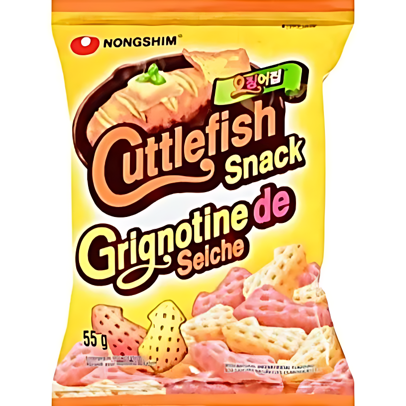 Crispy, savory seafood-flavored chips made with cuttlefish extract. They have a light crunch and a strong umami taste, making them a unique and addictive snack.